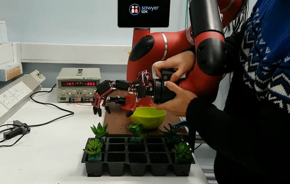 將10自由度機械夾爪與Sawyer結(jié)合,基于TP-GMR(任務(wù)參數(shù)化高斯混合回歸模型)的示教編程技術(shù),開展了Tray清理任務(wù)演示。
