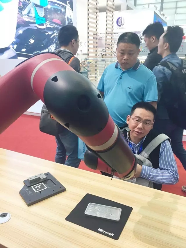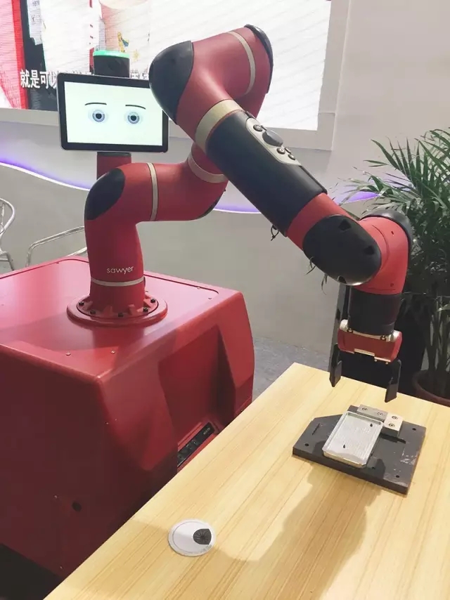 能干的Sawyer妹妹在展位右側(cè)模擬展示智能手機(jī)殼裝配作業(yè)場(chǎng)景,她通過(guò)內(nèi)置的攝像頭自動(dòng)抓取手機(jī)殼(自動(dòng)修正來(lái)料偏差),并準(zhǔn)確的將手機(jī)殼裝配在治具上。Sawyer不僅能固定工位工作,加載AGV后還可自由行走,完成遠(yuǎn)距離不同工位的作業(yè)。