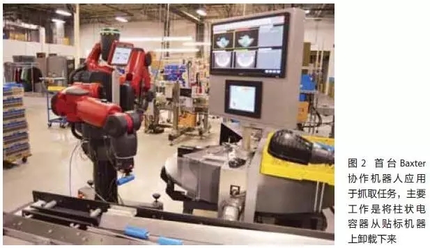 首臺Baxter協(xié)作機器人應用于抓取任務,將柱狀電容器從貼標機器上卸載下來。這項沉悶的工作此前由工人完成。Baxter的優(yōu)勢很快顯現(xiàn)出來。工人和Baxter在同一生產(chǎn)線并肩工作,有工人提出讓Baxter在卸載電容器的時候同時檢查附帶的支架;另一位工人也建議了Baxter將零件裝載至貼標機。