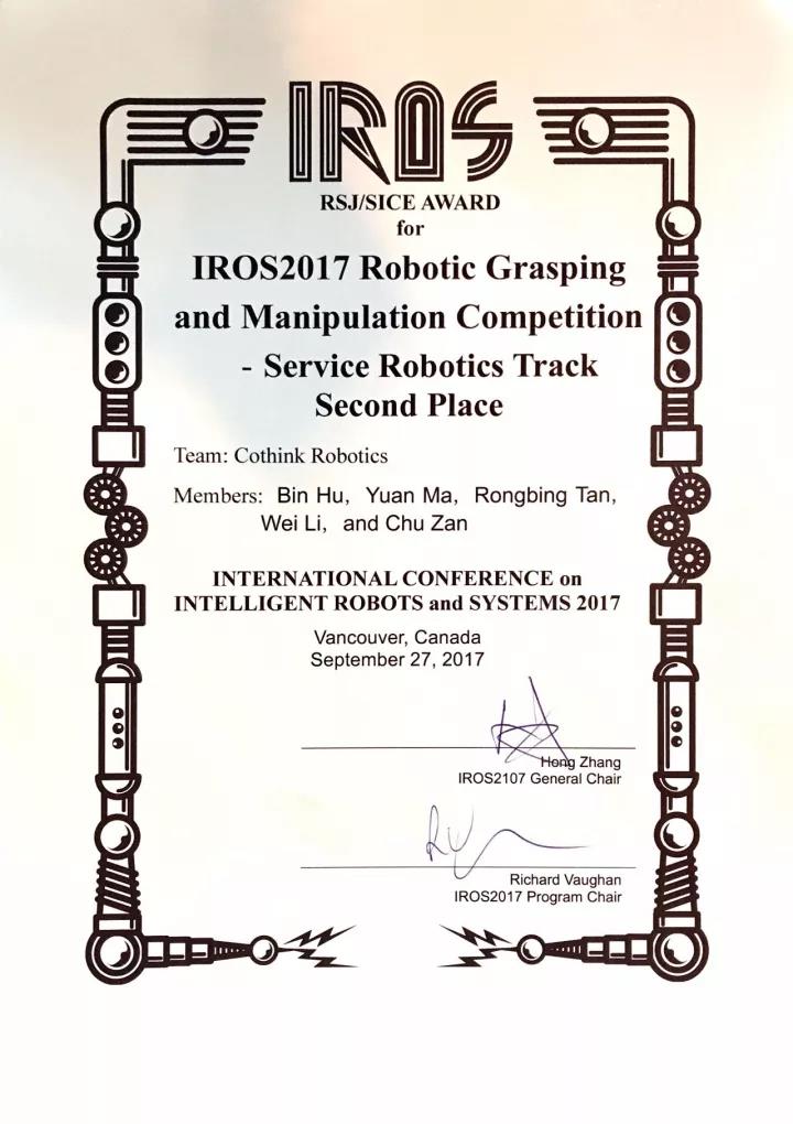 2017年9月24日至28日,第30屆IROS大會(huì)(國(guó)際智能機(jī)器人與系統(tǒng)大會(huì))在加拿大溫哥華隆重舉行,其9月26日舉辦的IROS 2017機(jī)器人抓取和模擬競(jìng)賽集聚了包括清華大學(xué)、劍橋大學(xué)、科羅拉多大學(xué)等全球頂尖的機(jī)器人技術(shù)團(tuán)隊(duì)同臺(tái)競(jìng)技。最終,瑞森可公司旗下非凡智能(FeiFan AI,瑞森可子公司)和瑞森可(Cothink)兩支技術(shù)團(tuán)隊(duì)?wèi){借出色的表現(xiàn)分別獲得工業(yè)裝配組冠軍和服務(wù)機(jī)器人組亞軍。