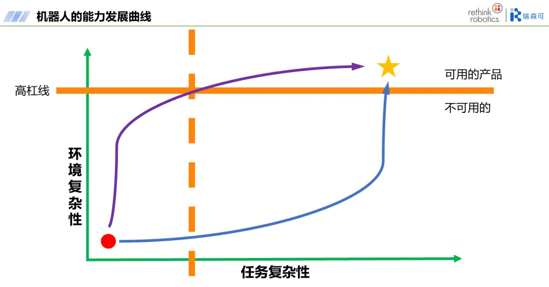 這張圖的大意是:人類所處的環(huán)境大部分是非結(jié)構(gòu)化的環(huán)境,所以我們?cè)趧?chuàng)建機(jī)器人產(chǎn)品的時(shí)候,隨著機(jī)器適應(yīng)環(huán)境的復(fù)雜程度,會(huì)有一條高杠線。線上的產(chǎn)品能夠在非結(jié)構(gòu)化的環(huán)境中靈活操作執(zhí)行任務(wù),線下的產(chǎn)品則受到環(huán)境的限制,只能執(zhí)行特定的少量任務(wù)。在現(xiàn)實(shí)情況中,機(jī)器除了要適應(yīng)環(huán)境的復(fù)雜性,還要適應(yīng)任務(wù)的復(fù)雜性。大部分公司在設(shè)計(jì)機(jī)器人之初,只考慮了如何在特定環(huán)境下,盡可能多地讓機(jī)器人去完成不同復(fù)雜任務(wù)。然而,隨著任務(wù)的難度增大,與之匹配的環(huán)境也愈發(fā)復(fù)雜,機(jī)器人的發(fā)展此時(shí)面臨著一個(gè)非常陡峭的斜坡。典型的就是工業(yè)機(jī)械臂,產(chǎn)品競(jìng)爭(zhēng)激烈,同質(zhì)化嚴(yán)重。在使得機(jī)器優(yōu)先適應(yīng)任務(wù)復(fù)雜性的設(shè)計(jì)前提下,轉(zhuǎn)而讓其去適應(yīng)非結(jié)構(gòu)化場(chǎng)景,基本是不可能的。