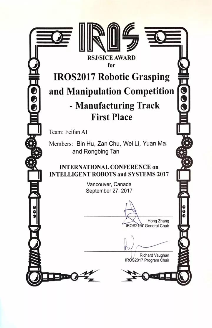 2017年9月24日至28日,第30屆IROS大會(huì)(國(guó)際智能機(jī)器人與系統(tǒng)大會(huì))在加拿大溫哥華隆重舉行,其9月26日舉辦的IROS 2017機(jī)器人抓取和模擬競(jìng)賽集聚了包括清華大學(xué)、劍橋大學(xué)、科羅拉多大學(xué)等全球頂尖的機(jī)器人技術(shù)團(tuán)隊(duì)同臺(tái)競(jìng)技。最終,瑞森可公司旗下非凡智能(FeiFan AI,瑞森可子公司)和瑞森可(Cothink)兩支技術(shù)團(tuán)隊(duì)?wèi){借出色的表現(xiàn)分別獲得工業(yè)裝配組冠軍和服務(wù)機(jī)器人組亞軍。
